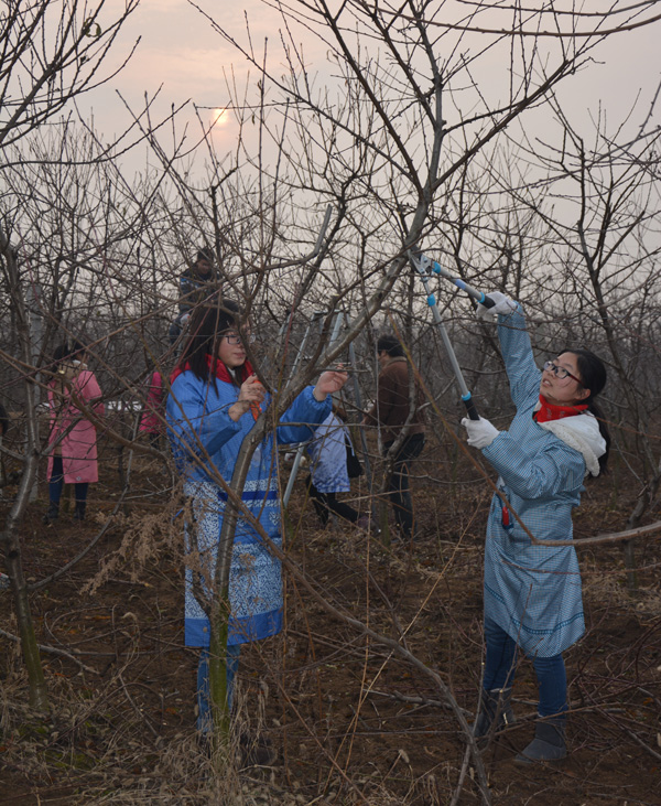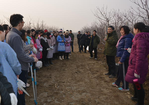 院长冯建灿一行在果园里观察巡视一圈儿后,领队老师把同学们都集中到一起,冯建灿对同学们的修剪进行了指导评议,并对实习效果提出了明确要求,他指出,本次实习条件艰苦,机会难得,同学们在这大冷天到离校近千里的野外实习,一定不要辜负了自己的辛苦、老师的心血和学校高标准人才培养的目标期望,要带着“为什么”,“怎么做”和“从什么地方改进和突破”这3个问题去完成本次的实习任务。首先同学们要明白为什么要来实习,下剪之前要想一想为什么要从这里下剪而不从那里下剪,不同果树为什么要修剪成不同的树型等等,多给自己、给老师提一些问题,然后联系课堂知识,决定当下该怎么做,探寻怎么做才能省时省力、高效快捷,同时还能保持修剪后的果树持续强壮且丰产丰收,最后还要想一想,目前我们的修剪方法、技术,工具是不是最好的,还有没有办法或是从哪方面进行突破可以让这项工作更轻松更省事,从而不断寻找探索,促成以后的实用发明和实践创新。总之要多动脑,多动手,多提问,多实践,充分把握眼前机会,理论联系实际,努力提高生产实践技能,长知识,增本领,为将来打下坚实基础。