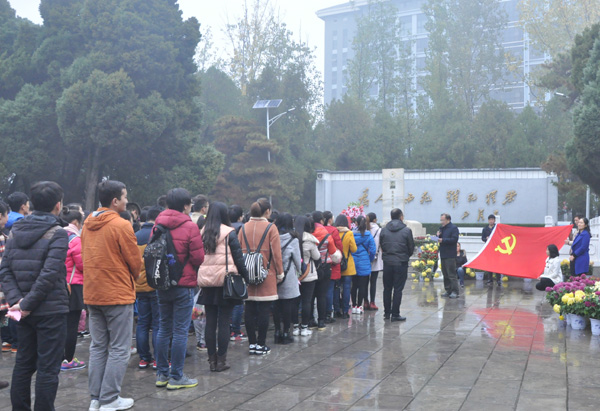 全体人员在焦裕禄纪念园进行拜谒瞻仰。院党委副书记侯亚兵老师主持拜谒仪式。焦裕禄纪念园里,松柏长青,庄严肃穆。在焦裕禄烈士墓前,全体人员肃立,由研究生和本科生的党员代表为焦裕禄烈士献花篮,并带领全体党员向焦裕禄烈士墓碑三鞠躬。