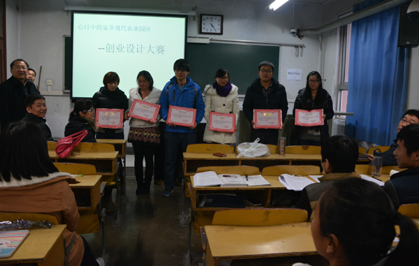 2015年1月5日下午,在3号楼514教室,“心目中的家乡现代农业园区”规划设计大赛成功举行。设计评选大赛由任课教师李胜利主持,孙治强副院长对大赛的意义及要求进行了讲解。参加决赛的14名选手通过PPT展示了自己家乡的现代农业园区规划。学院领导及部分教师作为评委,最终评选出6份优秀规划书,院系领导当场为获奖的同学颁发了荣誉证书及奖品。