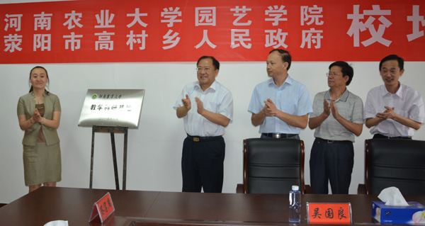 省级特聘教授吴国良、副院长马长生等共同为 “河南农业大学教学科研基地”金色铜牌揭下了红盖头。签约仪式由高村乡党委副书记狄恩仓主持,河南农业大学地方合作处、纸牌游戏在线