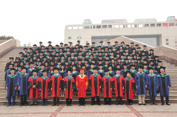 毕业典礼暨学位授予仪式结束后,院领导与毕业生在大礼堂台阶合影留念。