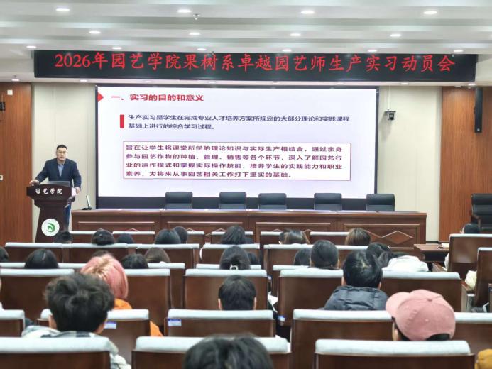 会上,果树系主任焦健围绕本次生产实习,全面细致地解读了总体安排、实习内容、任务要求及关键注意事项,清晰锚定实习目标,精准界定考核标准,为同学们顺利开展实习奠定了良好基础。焦健指出,生产实习是人才培养的重要实践环节,勉励全体同学珍惜此次实习机会,主动深入生产实际,在园区基地、科研院所以及产业一线中观察问题、分析问题、解决问题,不断深化对现代园艺产业的认识,拓宽专业视野,提升知行合一的能力。会议中,重点强调人身安全与遵纪守法是所有实践环节不可逾越的底线,也是实习顺利推进的根本保障,全体实习学生要牢固树立安全意识,严格遵守学校和实习单位各项管理规定,服从指导教师和实习单位安排,确保实习过程安全、有序、高效。