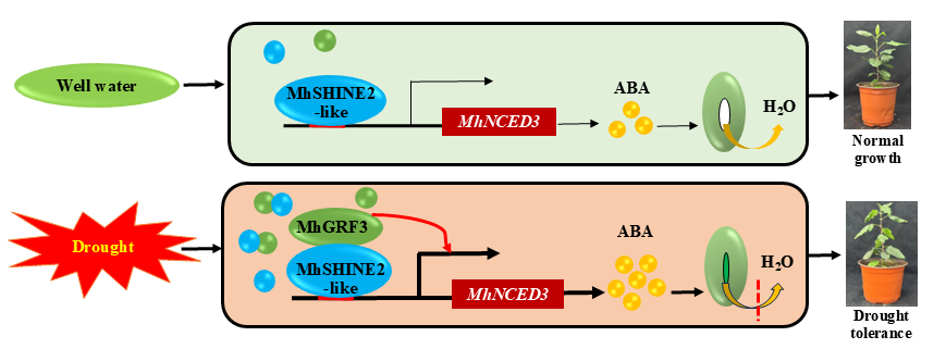 总之,研究人员提出一个工作模型,该模型展示了 MhSHINE2-like与MhGRF3相互作用,激活 MhNCED3 的表达,从而促进了ABA的积累并调节了气孔关闭,增强了苹果植株的抗旱能力(Figure 4 )。