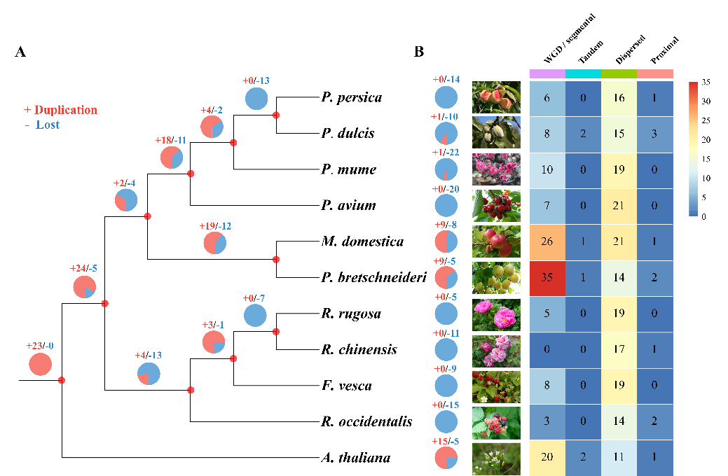该研究首先在全基因组水平上对10个蔷薇科物种进行了深度挖掘,共鉴定并分类了297个CDPK基因,将其划分为5个亚家族。基因复制分析表明,全基因组复制(WGD)/片段复制和分散复制(dispersed duplication)是推动蔷薇科CDPK基因家族扩张的主要驱动力,且Ka/Ks比值表明这些基因经历了强烈的纯化选择。在月季中,分散复制是驱动该家族扩张的关键因素。