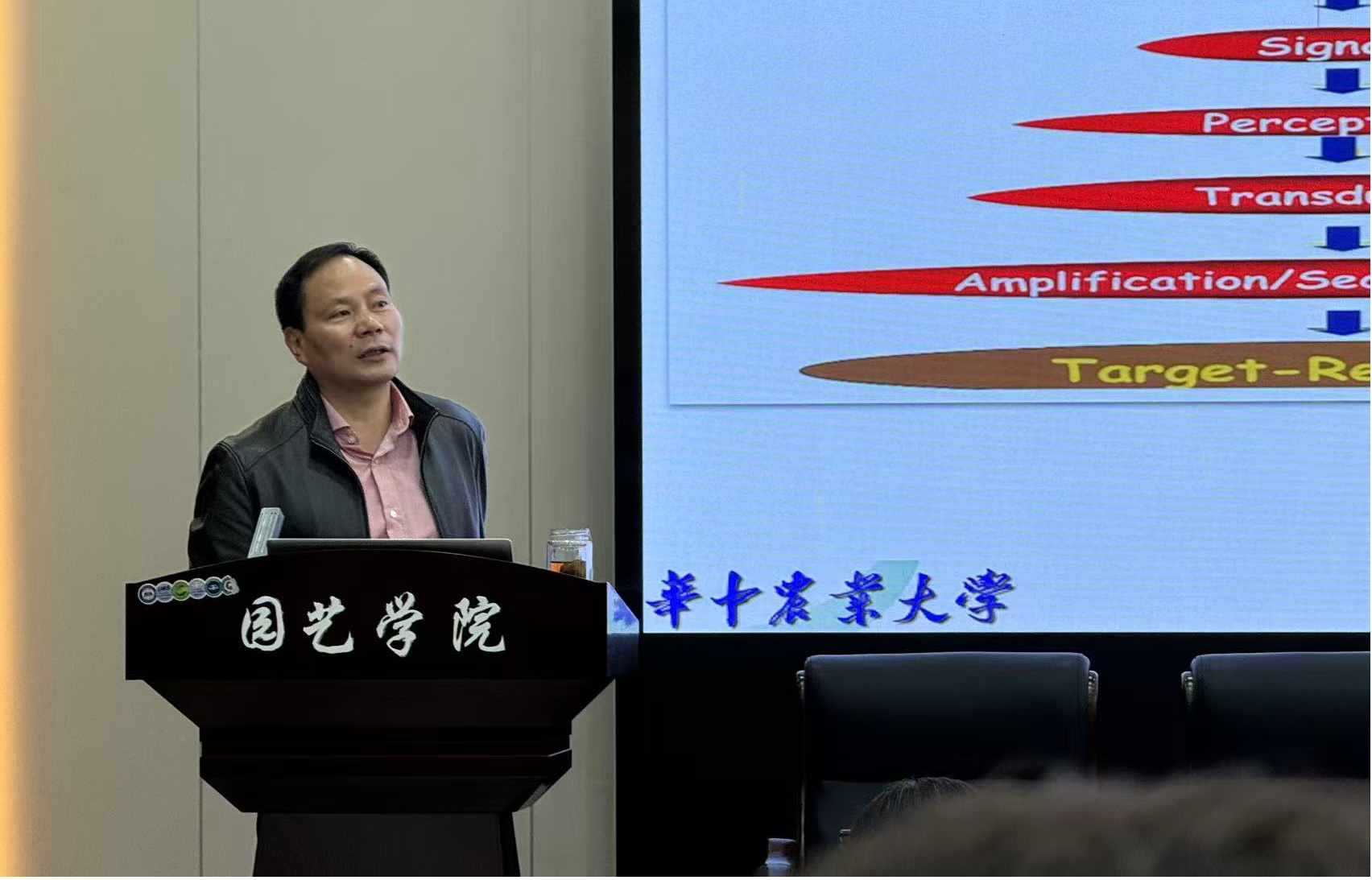 刘继红教授做了题为《柑橘抗逆代谢基础及分子调控网络》报告。刘教授首先概述我国柑橘产业的发展现状,深入分析生产实践中面临的主要难点与挑战。随后,他系统梳理团队多年来在柑橘冷害研究中的思路与方法,并详细阐述柑橘抗冷的分子调控网络;内容涵盖脯氨酸、多胺、抗氧化物质、糖类等多种代谢物在冷害应答中的作用,以及它们与基因调控网络和表观遗传调控的协同关系。最后,刘教授介绍了《Horticulture Advances》期刊的基本情况,鼓励师生积极投稿,分享科研成果。