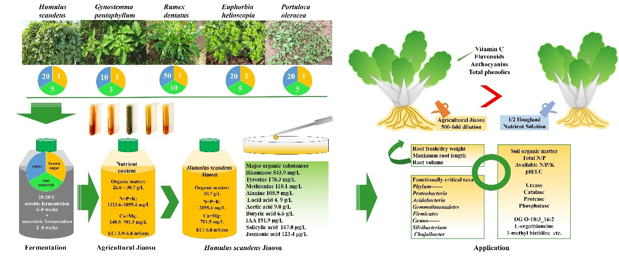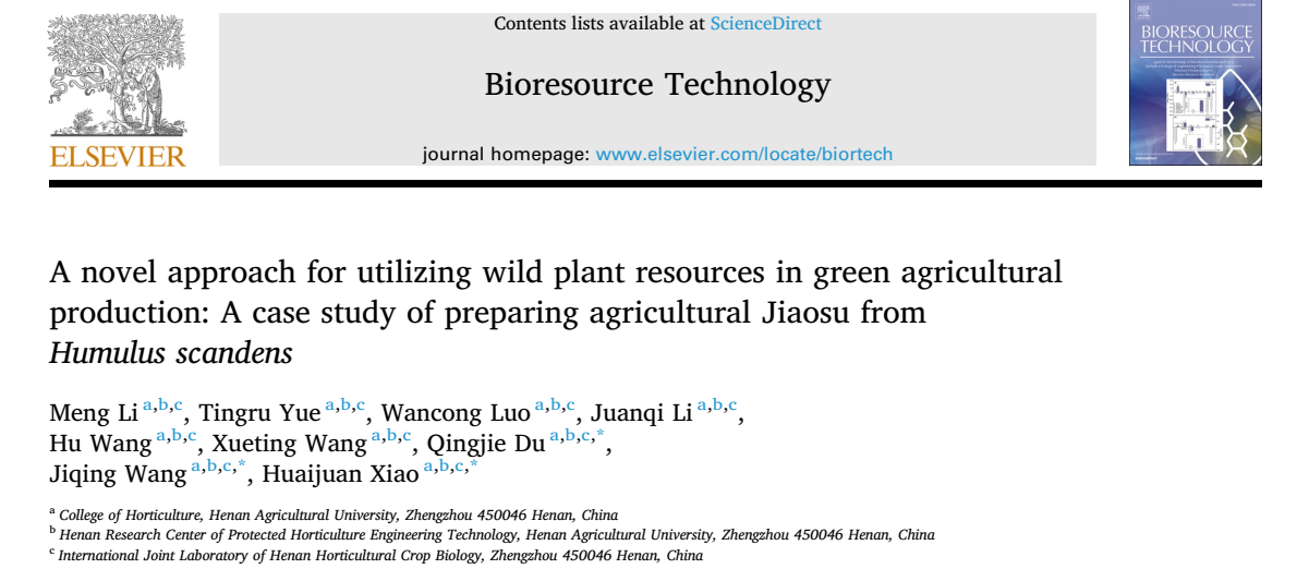 近日,河南农业大学园艺学院设施蔬菜栽培科技创新团队在环境科学与生态学领域一区TOP期刊《Bioresource Technology》(IF 9.0)上发表了题为《A novel approach for utilizing wild plant resources in green agricultural production: A case study of preparing agricultural Jiaosu from Humulus scandens》的研究论文。该研究系统探讨了利用五种常见野生植物(葎草、绞股蓝、齿果酸模、泽漆、马齿苋)制备农用酵素的可行性,并深入解析了其在提升作物品质、改良土壤微生态等方面的作用机制,为野生植物资源的高值化利用与农业绿色转型提供了新路径。