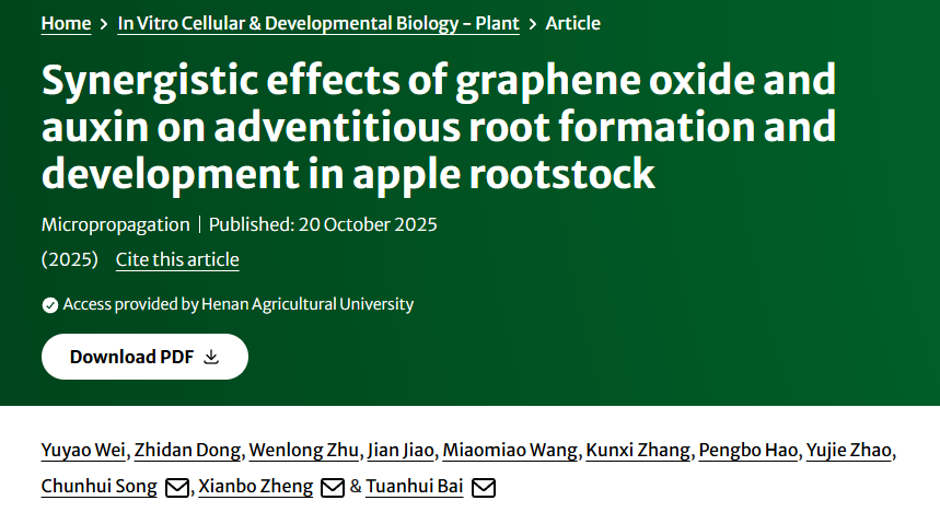 近日,河南农业大学园艺学院苹果逆境生物学与简约栽培技术团队在In Vitro Cellular & Developmental Biology-Plant发表题为“Synergistic effects of graphene oxide and auxin on adventitious root formation and development in apple rootstock”的研究论文,揭示了IBA和GO协同调控苹果砧木不定根形成和生长的机制,为苹果无性系矮化砧木的繁育提供理论指导。