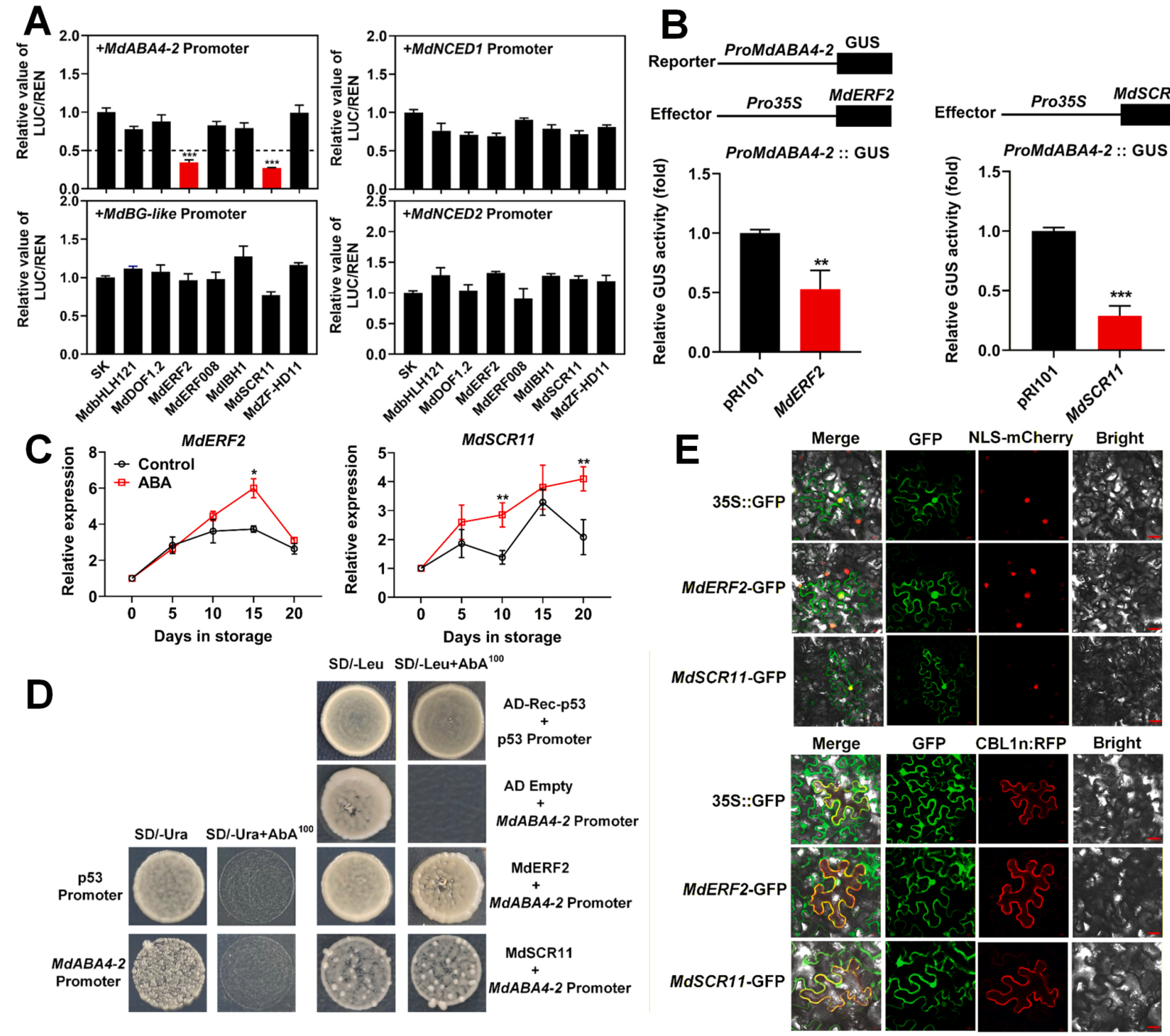 Fig. 2. The trans-repression of MdERF2 and MdSCR11 on the MdABA4–2 promoter.