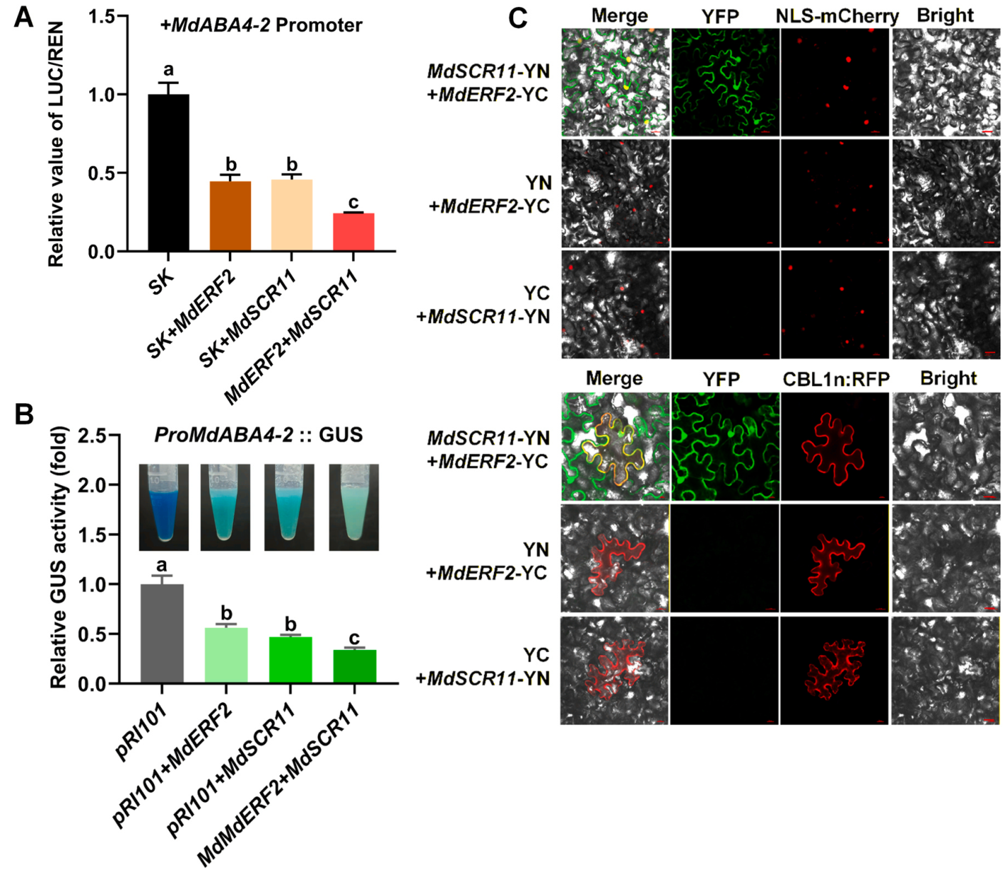 研究人员利用LUC、GUS和Y1H等技术体系,发现ABA响应的转录因子MdERF2和MdSCR11能够直接结合并转录抑制ABA合成负相关基因MdABA4-2的启动子(Fig.2)。进一步,利用LUC、GUS和BiFC技术发现, MdERF2和MdSCR11之间能够形成蛋白互作,且能够协同抑制MdABA4-2的表达(Fig.3)。