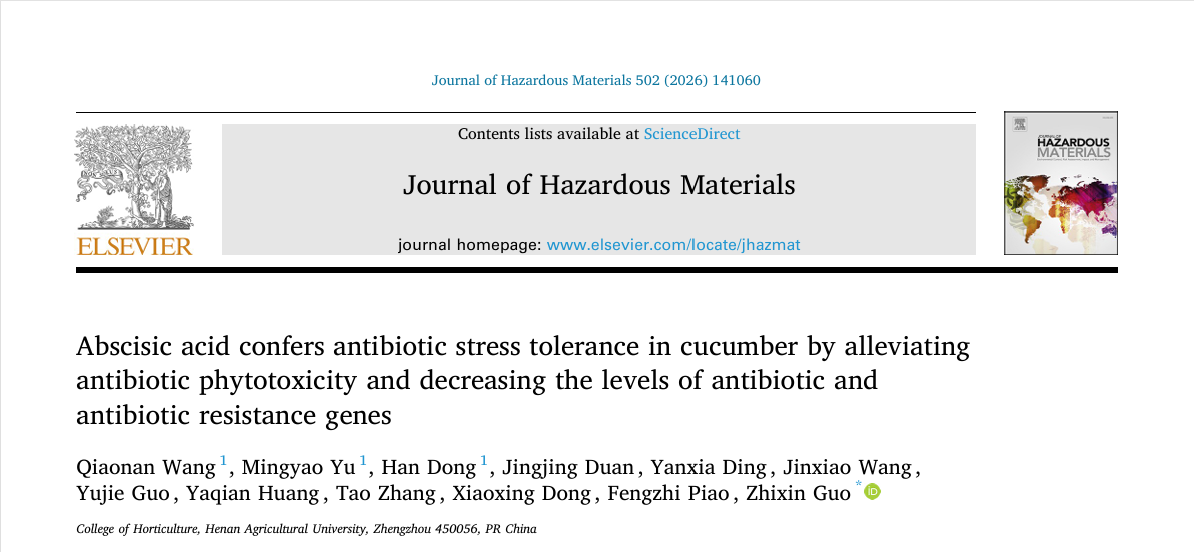 近日,河南农业大学园艺设施结构与环境研究团队的研究成果“Abscisic acid confers antibiotic stress tolerance in cucumber by alleviating antibiotic phytotoxicity and decreasing the levels of antibiotic and antibiotic resistance genes”在国际环境科学与工程领域知名期刊Journal of Hazardous Materials (中科院1区Top,IF=11.3)在线发表。研究揭示了植物激素脱落酸消减黄瓜抗生素污染的新功能。研究结果为有效消减土壤-植物系统中抗生素累积及抗生素抗性基因传播提供了新思路。